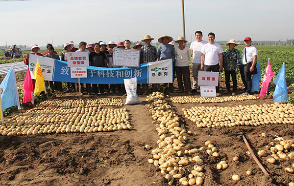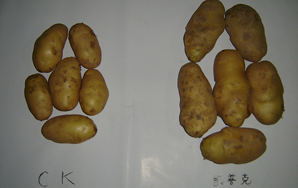 河南鄭州市滎陽(yáng)高村農(nóng)民黃海望,共種6畝馬鈴薯,其中5畝用的眾德套餐,眾德生物有機(jī)肥80公斤,15-10-20高鉀型眾德牌摻混肥100斤在翻地前施用,100斤15-10-20高鉀型眾德牌摻混肥種肥同播,出苗后用態(tài)康科250倍液噴施兩次,另外一畝做對(duì)照,同等有機(jī)肥,100公斤15-15-15含量的復(fù)合肥作底肥。施用眾德牌摻混肥的馬鈴薯莖葉不旺長(zhǎng),發(fā)根早、根粗、苗壯,中期苗高比對(duì)照高15-20厘米,長(zhǎng)勢(shì)好、病害少,收獲時(shí)馬鈴薯個(gè)頭大、品質(zhì)好、表面光滑,上市早,賣(mài)價(jià)高,產(chǎn)量比對(duì)照高58-60%,畝產(chǎn)達(dá)到6100多斤。